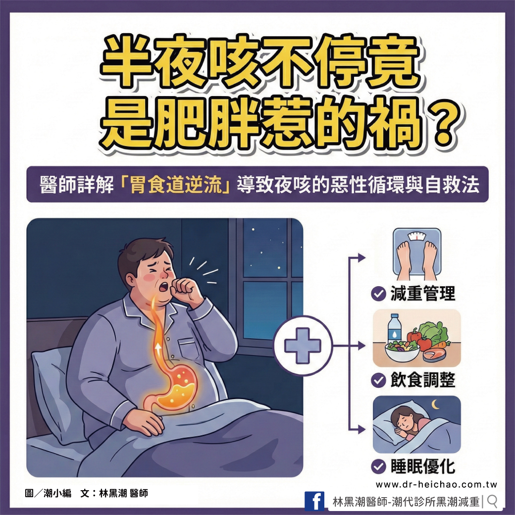 (關鍵字:胃食道逆流、夜咳、半夜咳嗽、慢性咳嗽、肥胖、胃酸逆流、火燒心、躺下就咳嗽、沒感冒半夜咳嗽、胃食道逆流咳嗽症狀、喉嚨卡卡、梅核氣、靜默型逆流、咽喉逆流、胃食道逆流改善、左側睡、減重改善胃食道逆流、睡眠障礙、減肥門診)