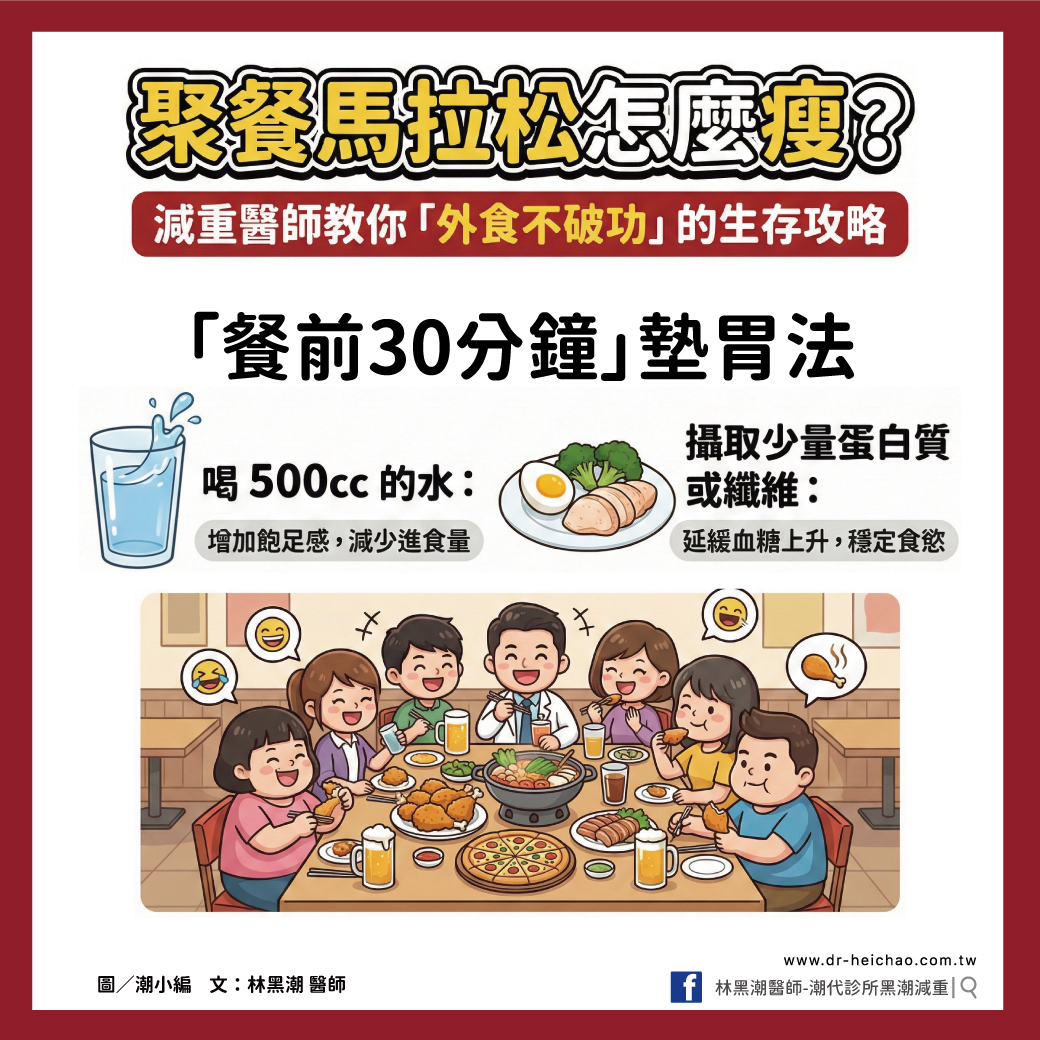 「醫生,我初二要跟老公回娘家吃辦桌,初三是高中同學會約吃義大利麵,初四還有好久不見的大學室友要去居酒屋...」 看著行事曆上密密麻麻的飯局,許多學員在診間焦慮地問我:「我是不是該把這些邀約都推掉?不然這幾個月瘦下來的成果又要泡湯了。」