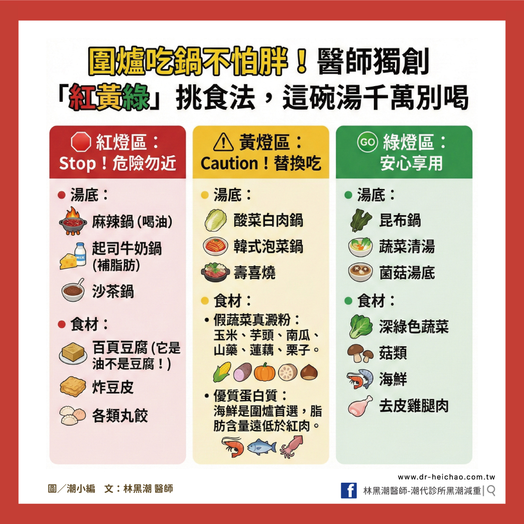 今天,我將公開診所內部教導學員的「紅黃綠」紅綠燈挑食法則,並從醫學角度剖析湯底、醬料與食材的選擇。只要掌握這套邏輯,今年過年,你絕對可以跟家人開心圍爐,年後站上體重計依然輕盈自信。