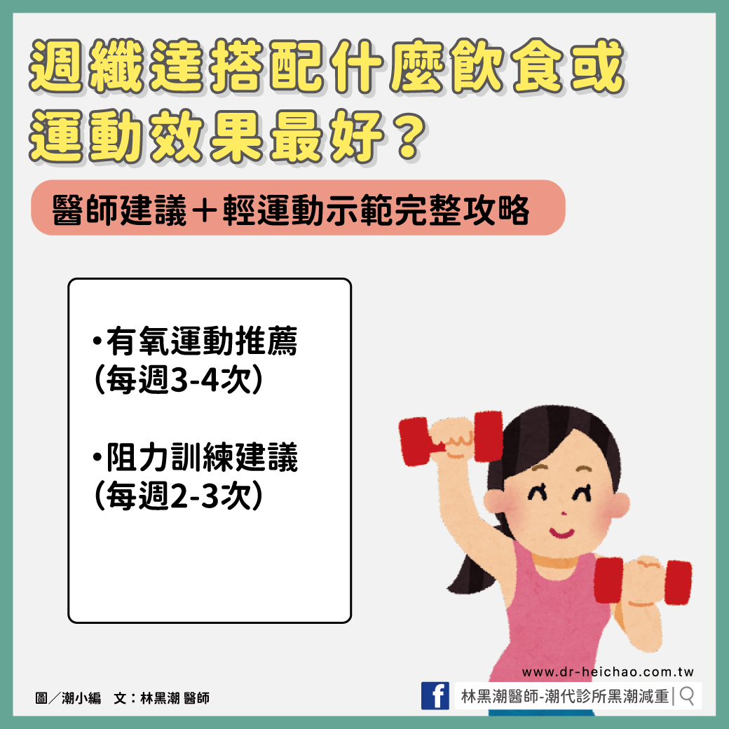 總結來說,週纖達雖然是「簡單又有效」的工具,它需要搭配正確飲食與運動,效果可以更持久而自然。低GI飲食能幫助穩定血糖,高蛋白飲食能守住肌肉量,而規律的有氧+阻力訓練則能讓體態更緊實。