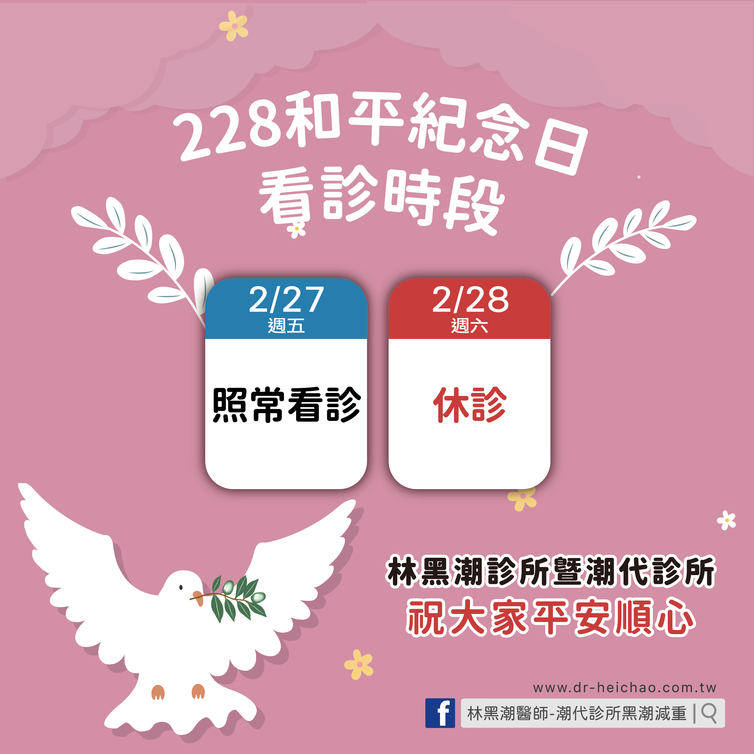 首頁 > 最新消息 > 【228和平紀念日看診公告】2/28(六)休診